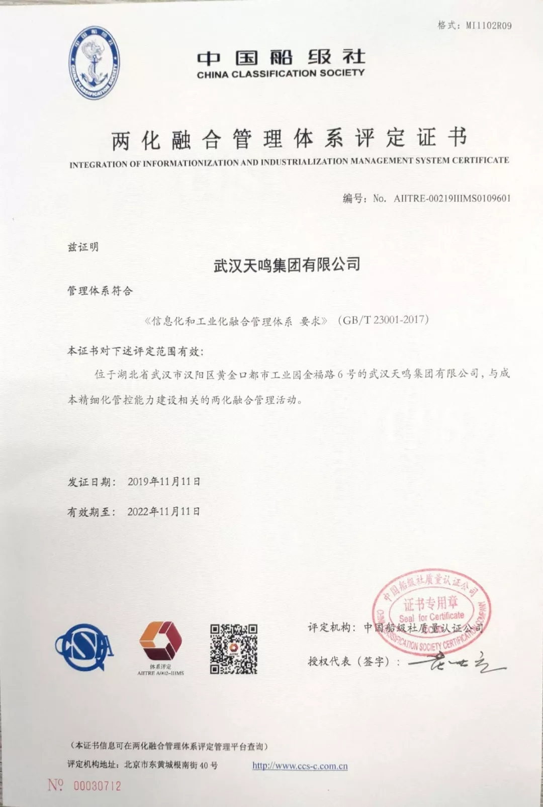 喜报| 武汉天鸣荣获“两化融合管理体系评定证书