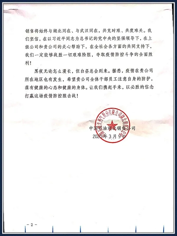 3月9日,武汉天鸣集团通过多渠道筹措抗击疫情重要物资,向中国石油天然气股份有限公司湖北销售分公司捐赠了10000支口罩及1000套防护服,表达对战斗在抗疫一线石油人的敬意,集团公司总经理洪伟同志参加捐赠活动。
