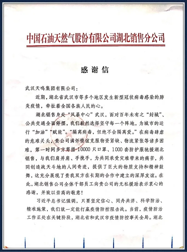 天鸣集团向中石油湖北销售分公司捐赠防疫物资